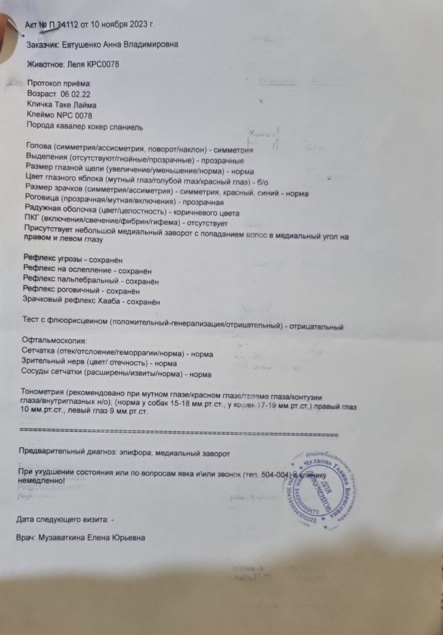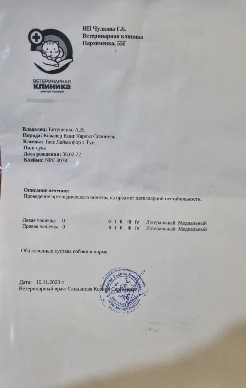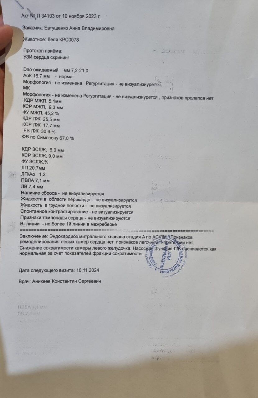 У нее прекрасные показатели здоровья, здоровое сердце, чистая генетика по породным заболеваниям.